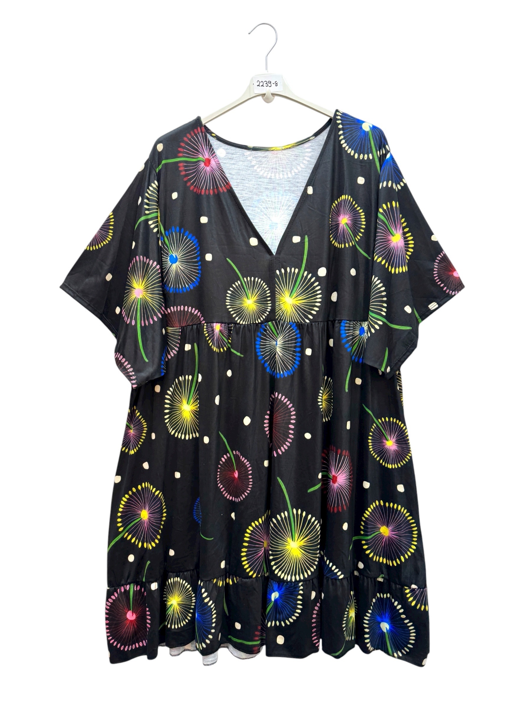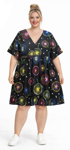 Kort neonmönstrad klänning i viskosjersey. Öppen V-ringning. A-linjeformad skärning med volang i nederkant. Mjukt och mycket stretchigt jerseytyg 97 % viskos, 3 % elastan
