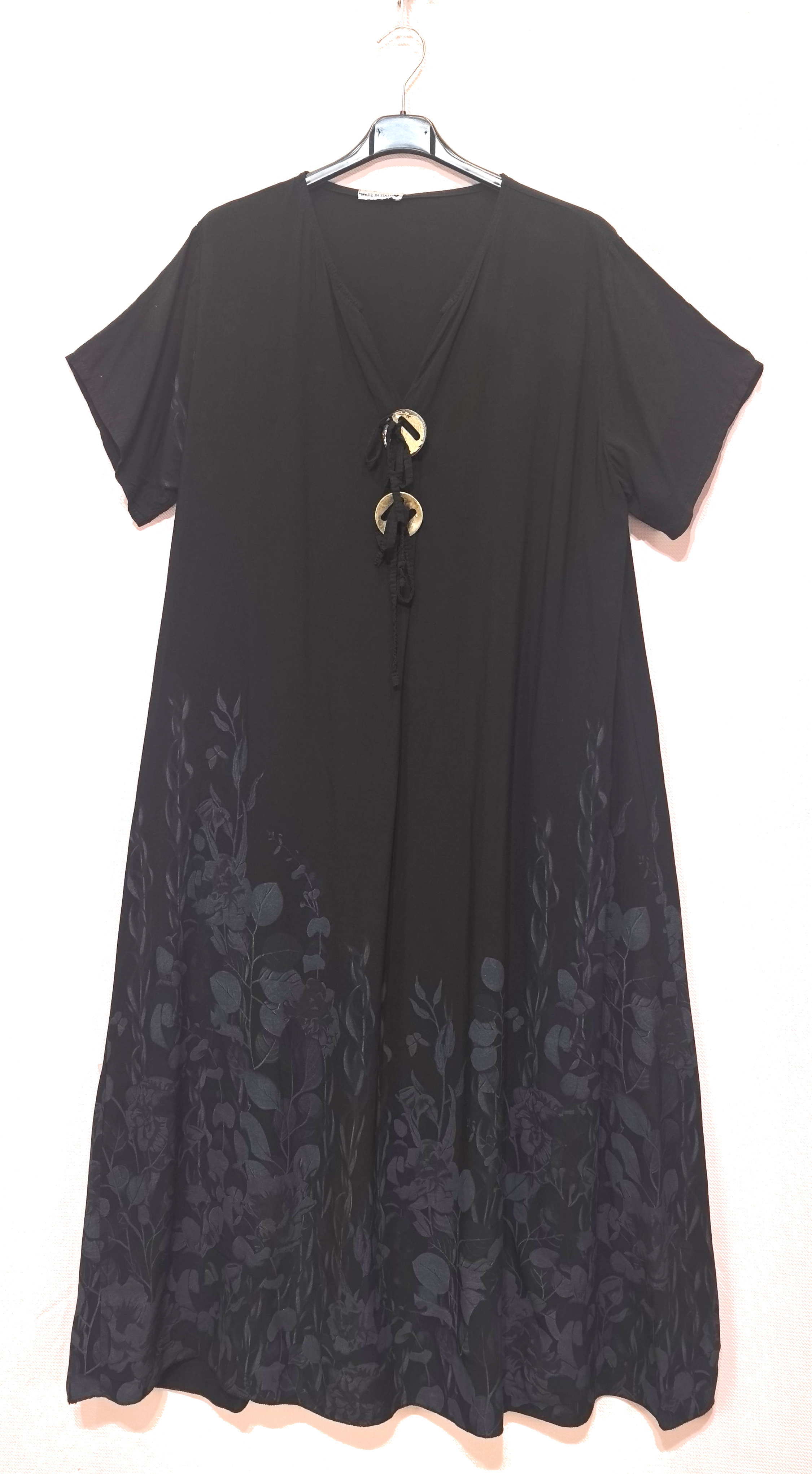 Valmistusmaa: ItaliaSvart maxiklänning med blomönster i volangen. Den är tillverkad av lätt viskostyg, vilket ger komfort och andningsförmåga. V-ringningen är prydd med dekorativ snörning och träknappr. Materialet lätt och behagligt 100% viskos