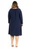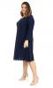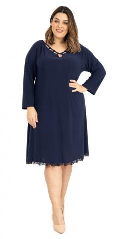 Marinblå klänning med spetsdekor i volangen och vacker utsirad halsöppning. A-linjeformad modell. Materialet stretchande och behagligt 95% polyester, 5% elastan.