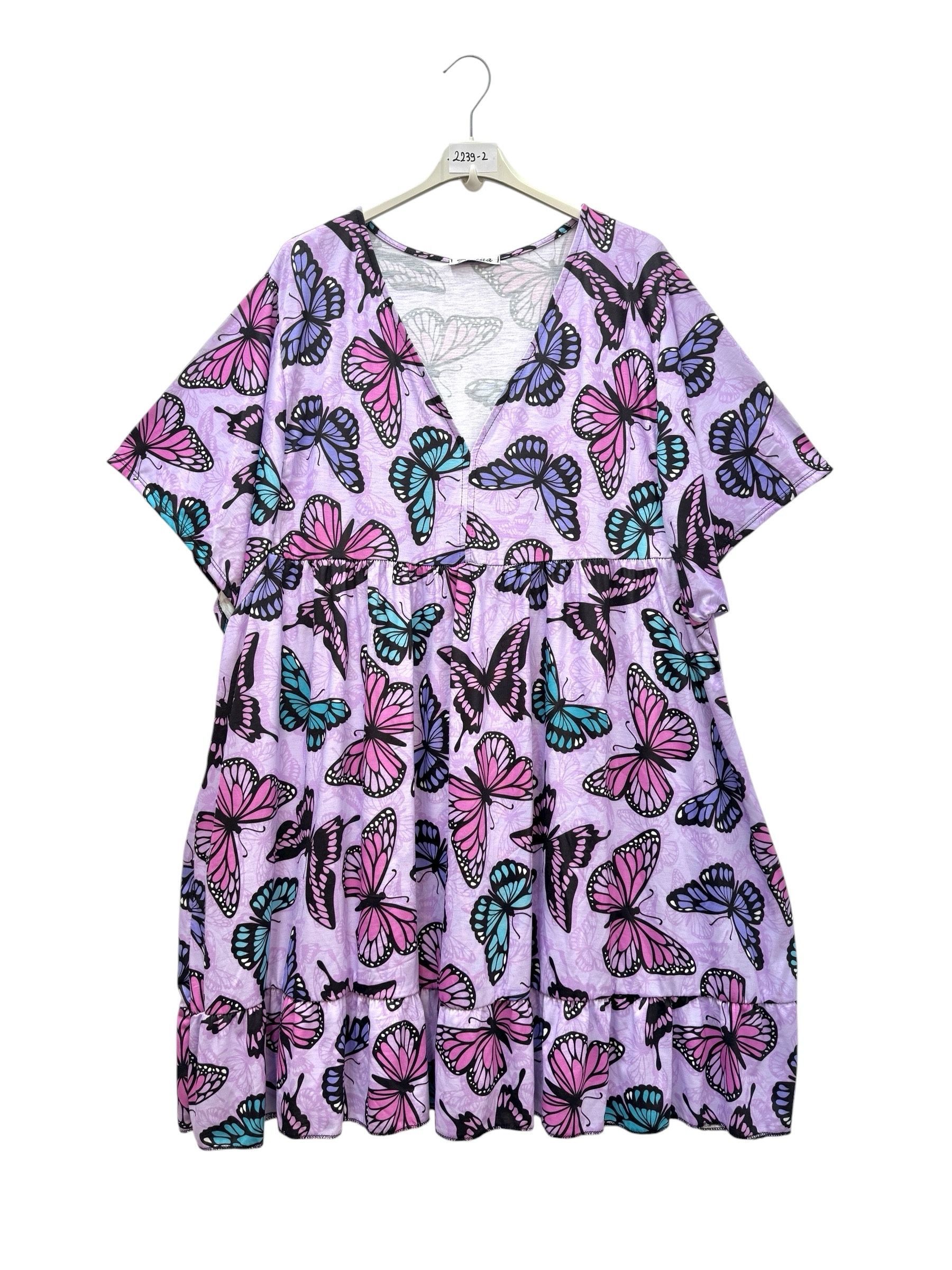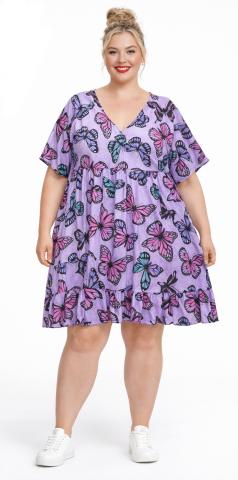 Valmistusmaa: ItaliaKort fjärilmönstrad klänning i viskosjersey. Öppen V-ringning. A-linjeformad skärning med volang i nederkant. Mjukt och mycket stretchigt jerseytyg 97 % viskos, 3 % elastan