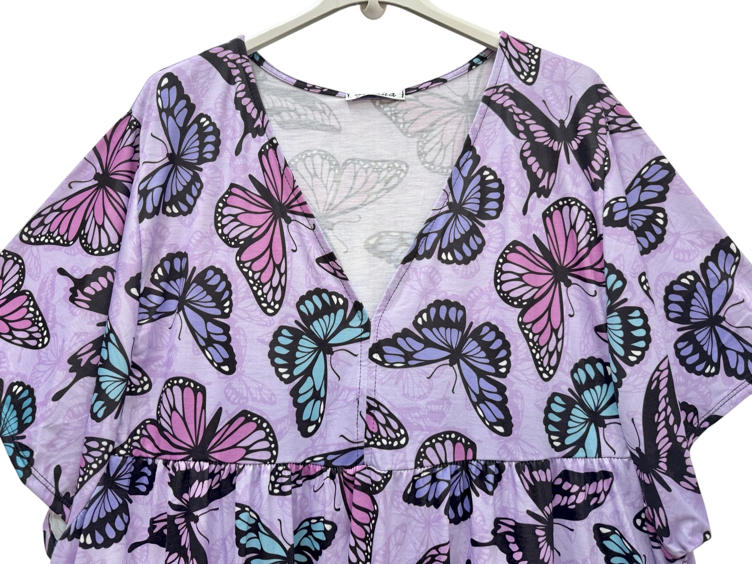 Kort fjärilmönstrad klänning i viskosjersey. Öppen V-ringning. A-linjeformad skärning med volang i nederkant. Mjukt och mycket stretchigt jerseytyg 97 % viskos, 3 % elastan
