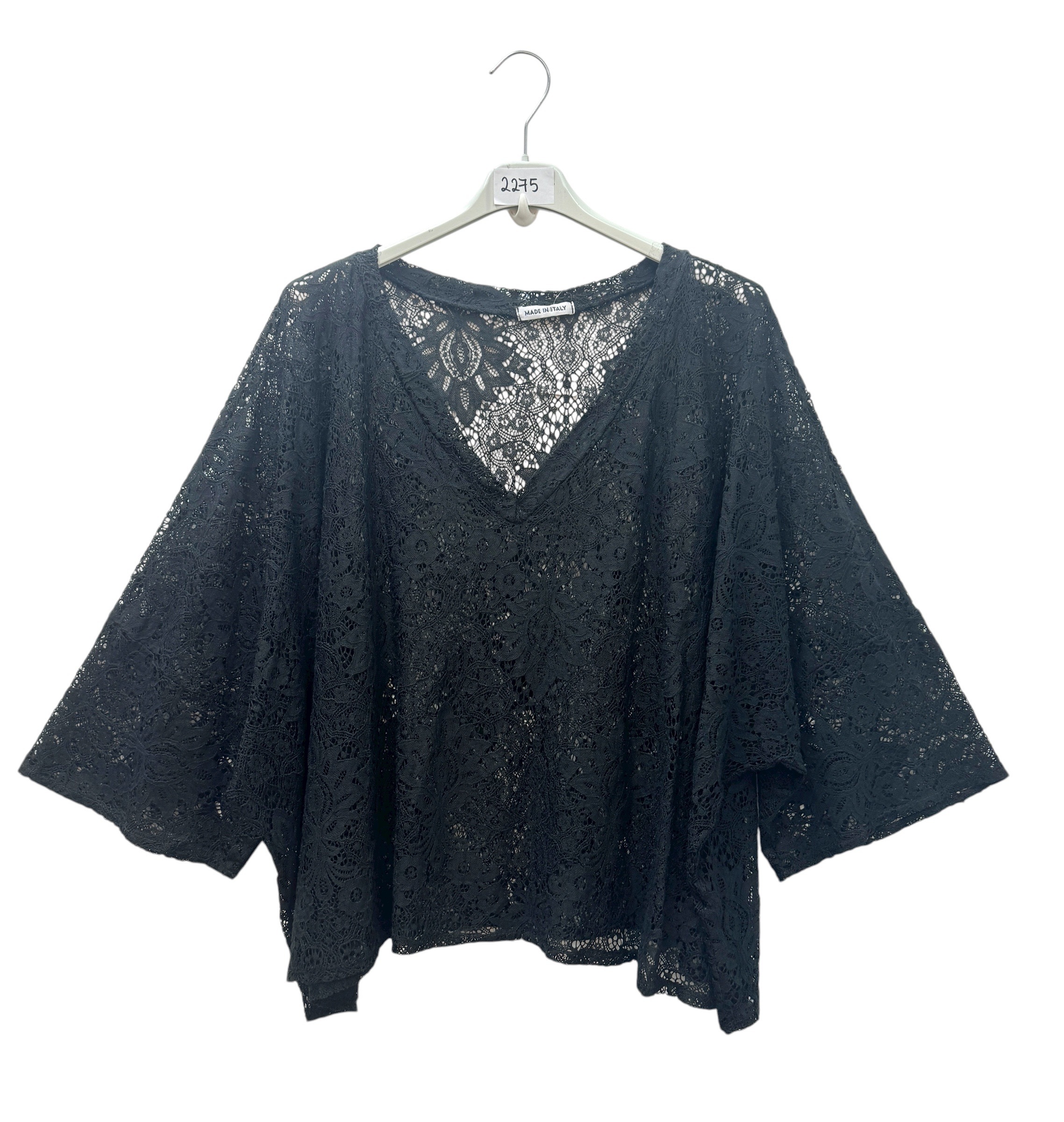 Valmistusmaa: ItaliaKort blus/ponchoblus i makraméspets med V-ringning. Extra lös, boxig passform med 3/4-dels nedsänkta ärmar. . Materialet lätt och behagligt 95 % bomull, 5 % elastan med vackert fall.