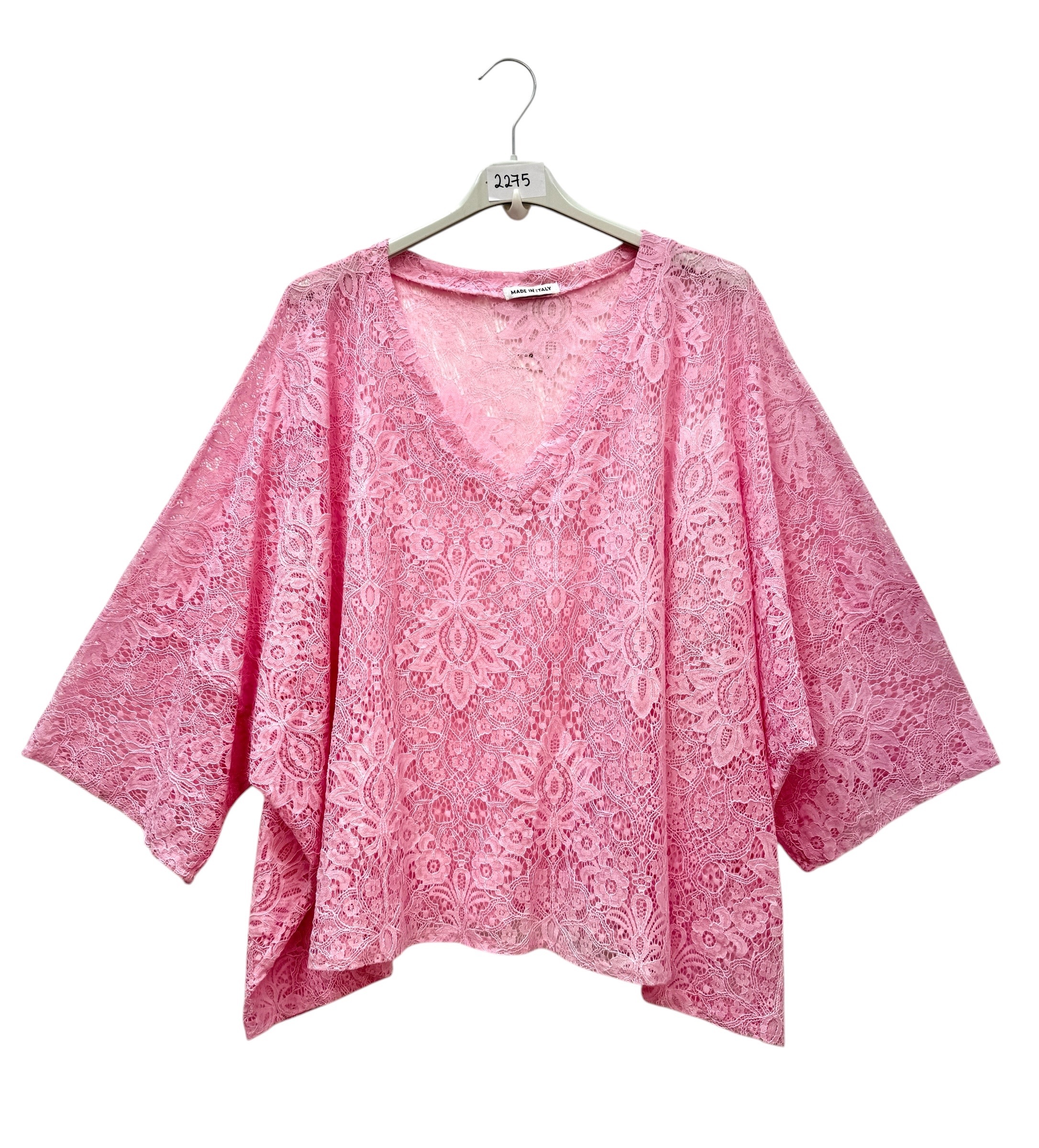 Valmistusmaa: ItaliaKort blus/ponchoblus i makraméspets med V-ringning. Extra lös, boxig passform med 3/4-dels nedsänkta ärmar. . Materialet lätt och behagligt 95 % bomull, 5 % elastan med vackert fall.