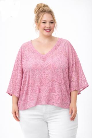 Kort blus/ponchoblus i makraméspets med V-ringning. Extra lös, boxig passform med 3/4-dels nedsänkta ärmar. . Materialet lätt och behagligt 95 % bomull, 5 % elastan med vackert fall.