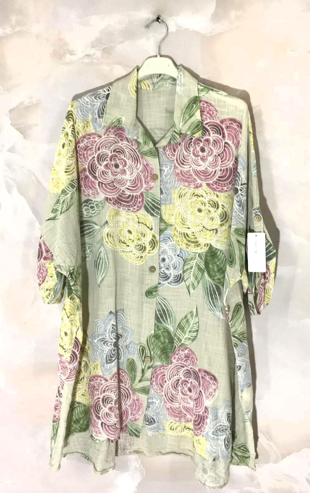 Valmistusmaa: ItaliaBeige, lätt blommönstrad tunikaskjorta. A-linjeformad modell med uppvikbara ärmar. Materialet lätt och behagligt 100 % bomull