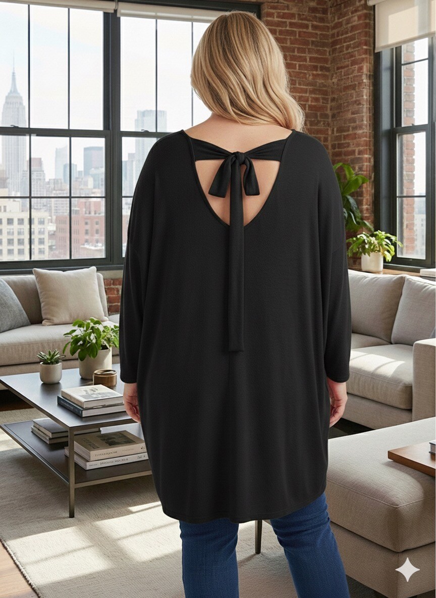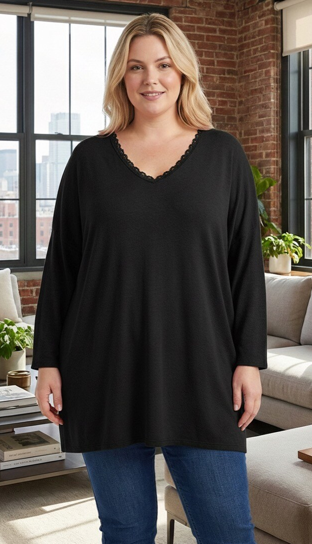 Svart mjuk finstickad tunika/tunikatröja med V-halsurringning och knytband baktill. Spetskant runt halsurringningen. A-lineformad modell med lätt nedsänkta ärmar. Materialet mjukt och behagligt 95% bomull, 5% elastan