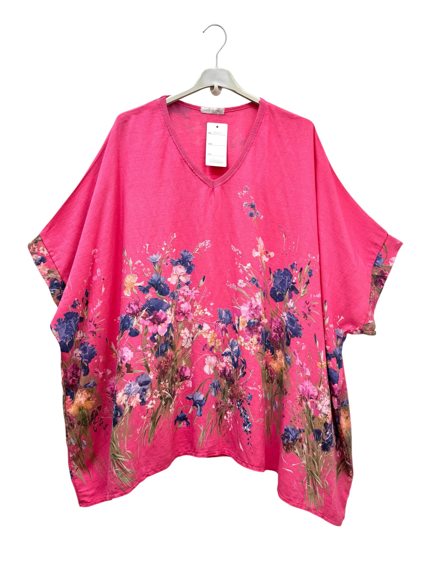 Tillverkad i ItalienKaunis V-aukkoinen tunika, jossa kukkakuvio. Kevyesti teksturoitua, kauniisti laskeutuvaa viskoosi crepekangasta. Rento suorakaiteen muotoinen malli, jossa lasketut hihat. Mallilla yllään tunika vaaleanpunaisena. Materiaalina kevyt ja miellyttävä 95% viskoosi, 5 % elastaani