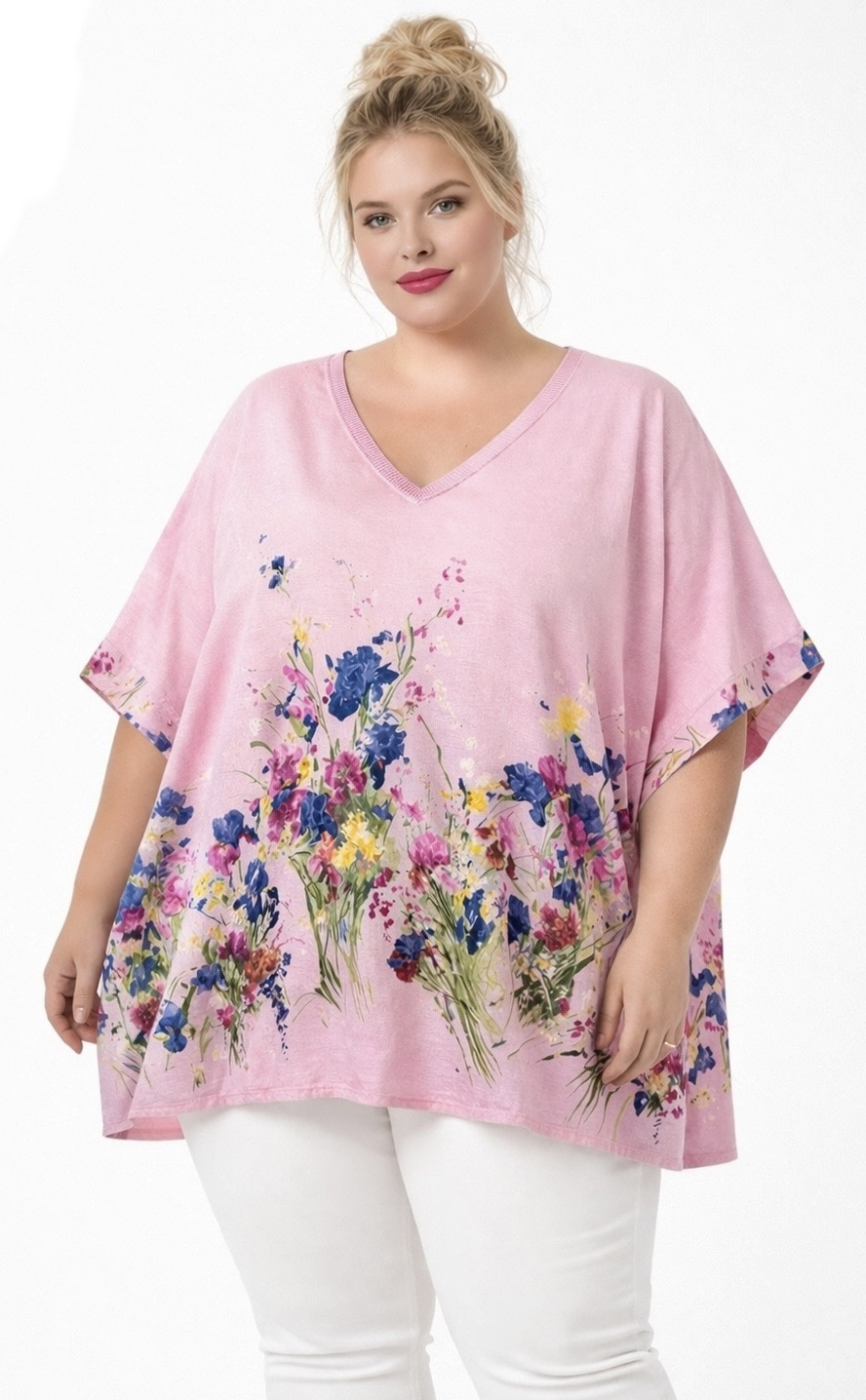 V-ringad tunika med blommönster i viskoscrêpe. Lätt texturerat men ändå böljande tyg. Avslappnad rektangulär form med nedsänkta ärmar. Modellen bär tunikan i rosa. Materialet lätt och behagligt 95 % viskos, 5 % elastan
