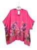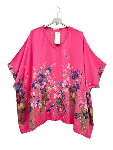 Valmistusmaa: ItaliaV-ringad tunika med blommönster i viskoscrêpe. Lätt texturerat men ändå böljande tyg. Avslappnad rektangulär form med nedsänkta ärmar. Modellen bär tunikan i rosa. Materialet lätt och behagligt 95 % viskos, 5 % elastan