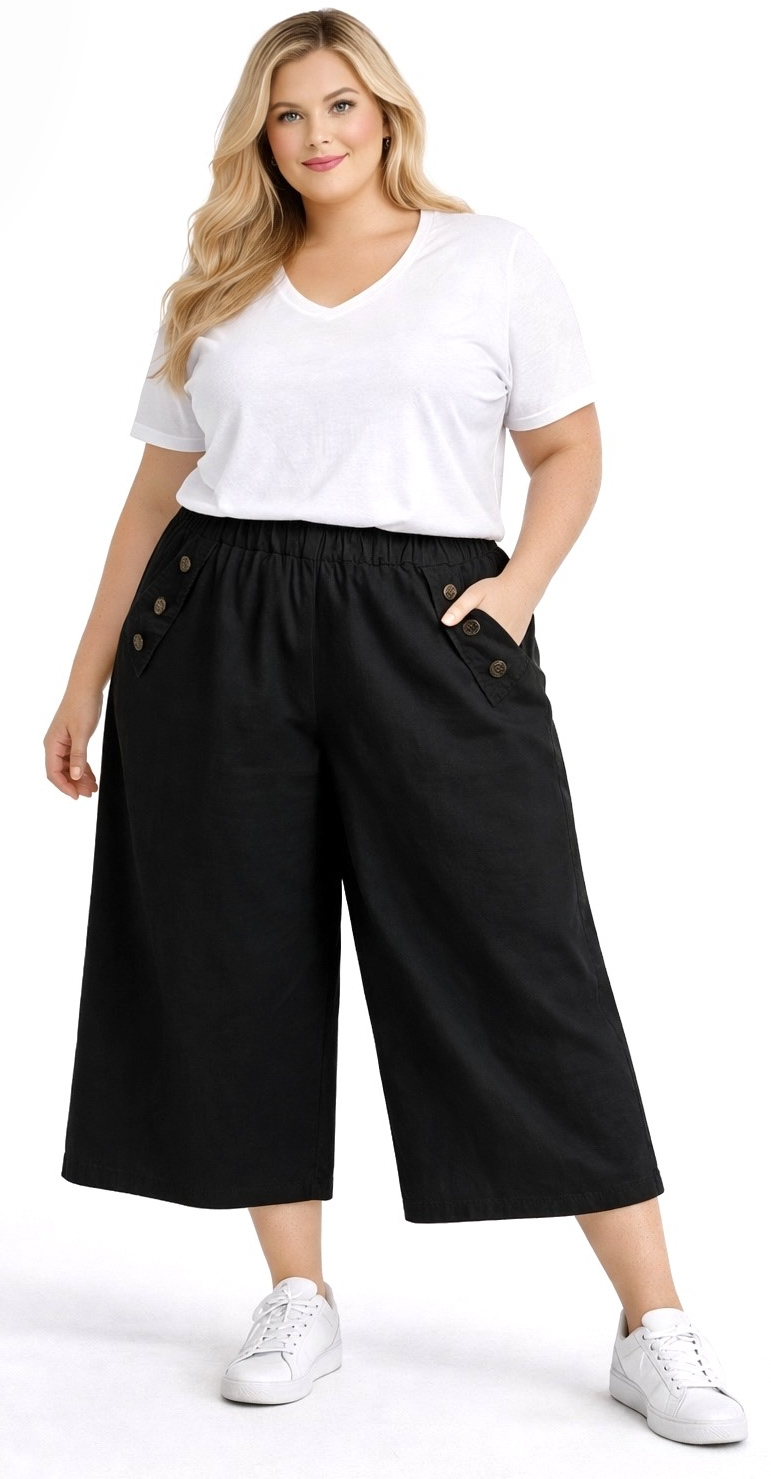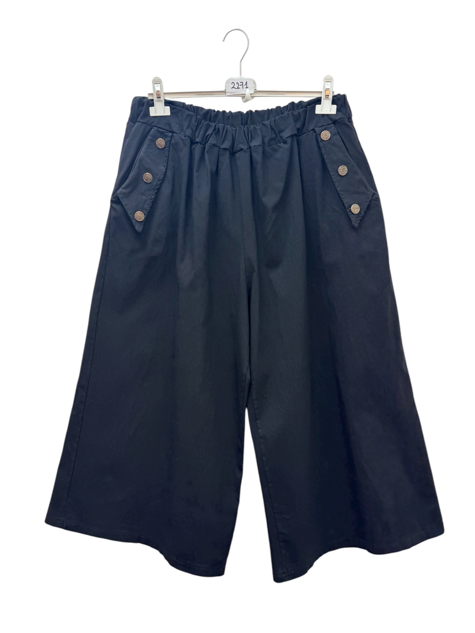Vida, croppade byxor/culottes med resår i midjan i ultrastretchig bomullsbengalin. Två påsydda framfickor med dekorativa knappar i sjömansstil. Medelhög midja, mycket bekväm passform. Materialet stretchande och behagligt 95% bomull, 5% elastanLeveälahkeiset cropatut housut / culottes-housut, joissa joustava vyötärönauha. Erittäin joustavaa puuvillabengaliinia. Kaksi etutaskua, joissa koristeelliset merimiestyyliset napit. Normaali vyötärö, erittäin mukava istuvuus. Materiaalina joustava ja miellyttävä 95% puuvilla, 5% elastaaniVida, croppade byxor/culottes med resår i midjan i ultrastretchig bomullsbengalin. Två påsydda framfickor med dekorativa knappar i sjömansstil. Medelhög midja, mycket bekväm passform. Materialet stretchande och behagligt 95% bomull, 5% elastan