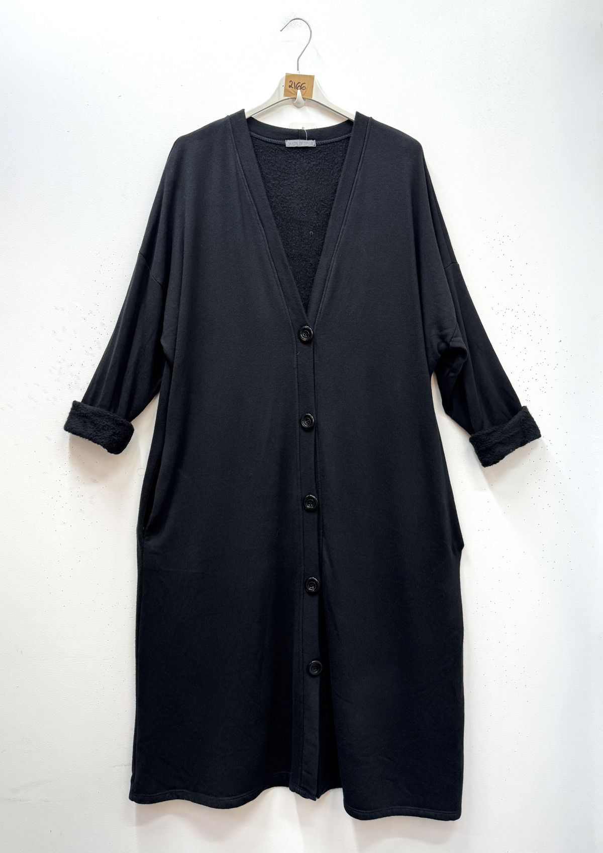 Valmistusmaa: ItaliaSvart mjuk och skön cardigan med fleecefoder. Stora knappar och fickor i sidorna. Kan användas även som klänning. Materialet stretchigt och behagligt 60% bomull, 30% ylle, 10% elastan