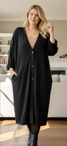 Svart mjuk och skön cardigan med fleecefoder. Stora knappar och fickor i sidorna. Kan användas även som klänning. Materialet stretchigt och behagligt 60% bomull, 30% ylle, 10% elastan