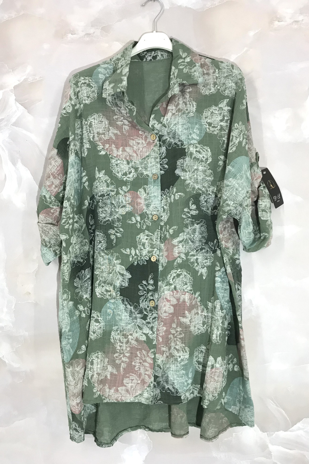 Valmistusmaa: ItaliaKhakigrön, lätt blom- och bollmönstrad tunikaskjorta. A-linjeformad modell med uppvikbara ärmar. Materialet lätt och behagligt 100 % bomull
