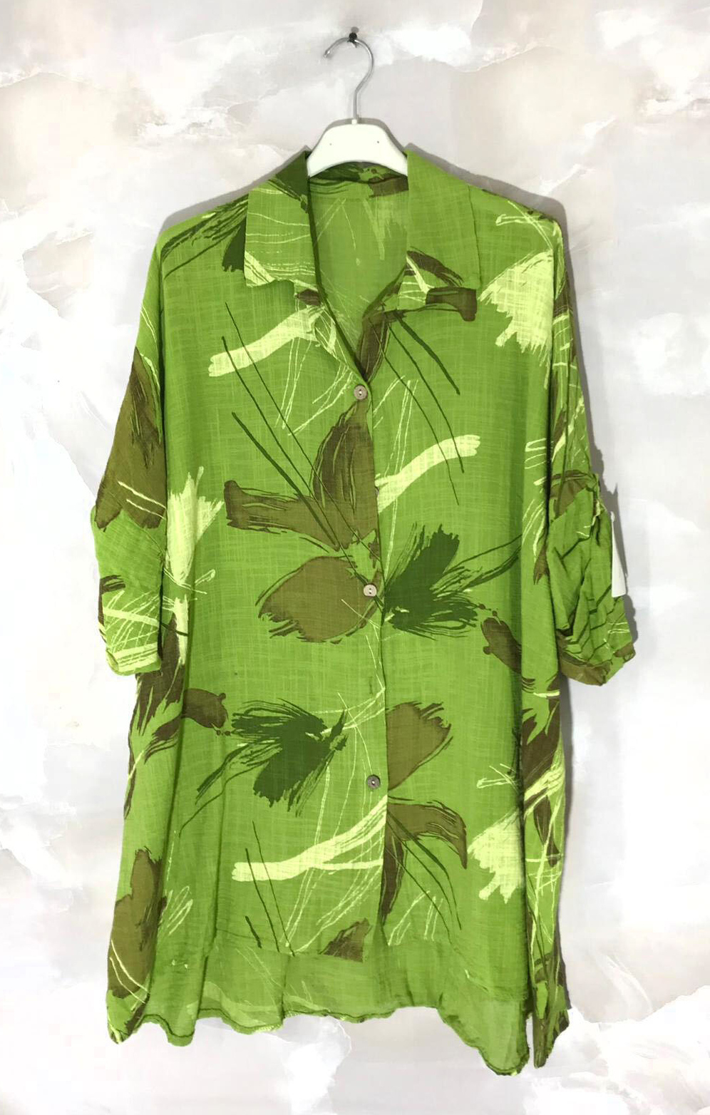 Valmistusmaa: ItaliaLimegrön, lätt lövmönstrad tunikaskjorta. A-linjeformad modell med uppvikbara ärmar. Materialet lätt och behagligt 100 % bomull