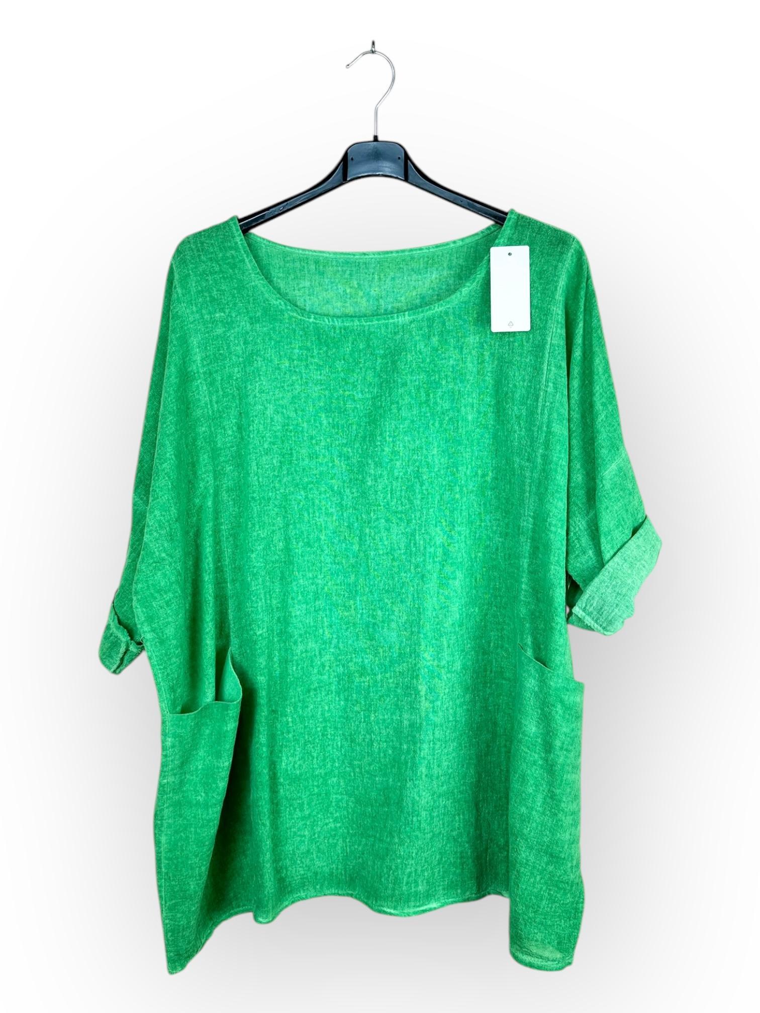 Valmistusmaa: ItaliaGrön oversizetunika med fickor. Halvlånga ärmar. Materialet lätt och behagligt 90% bomull, 10% linne