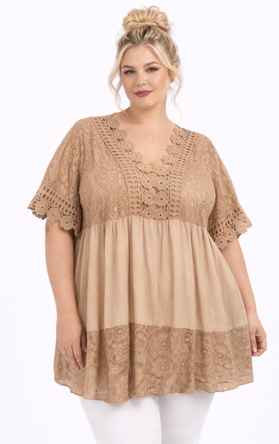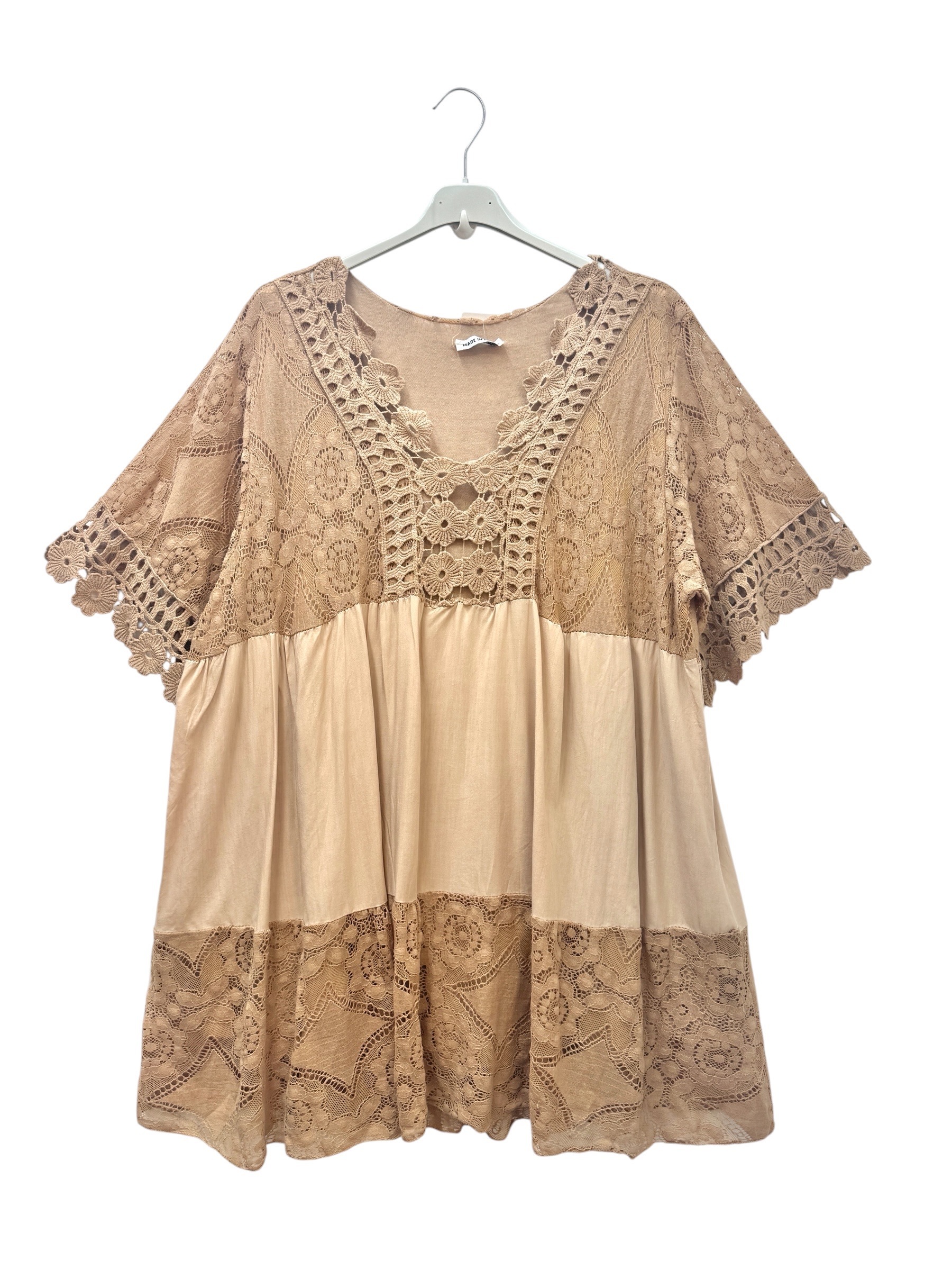 Valmistusmaa: ItaliaTaupe lätt tunika med spetsdekor. V-halsurringning. A-linjeformad modell. Materialet lätt och behagligt 60 % bomull, 40 % viskos.