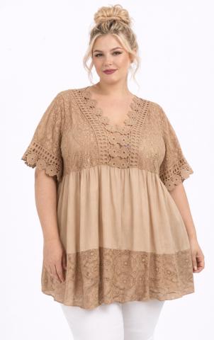 Taupe lätt tunika med spetsdekor. V-halsurringning. A-linjeformad modell. Materialet lätt och behagligt 60 % bomull, 40 % viskos.