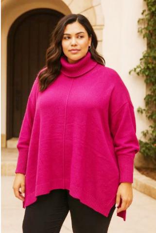 Tillverkad i KinaFuksia svetaritunika/tunikaponcho poolokauluksella. Materiaalina pehmeä ja miellyttävä 35% viskoosi, 30% polyamidi,15% modal, 10% kashmir, 10% elastaani