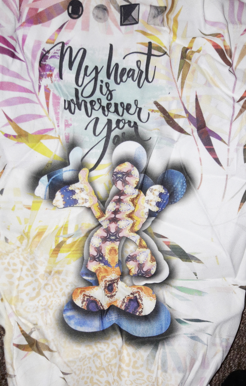 Keltaasävyiset joustokankaiset housut Mikki siluetilla ja lehtikuviolla. Vyötärössä kuminauha ja nyöri. Lahkeen sisäsauman mitta ilmoitettu ilman taitoksia. Materiaalina joustava ja miellyttävä 65 % puuvilla, 30 % polyesteri, 5 % elastaani.