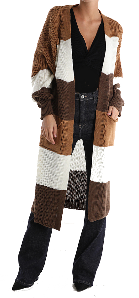 Ruskea-valkoraidallinen pitkä neuletakki taskuilla. Lisäkuvat sinisestä takista. Materiaalina joustava ja miellyttävä 100 % akryyli.Valmistusmaa: Italia