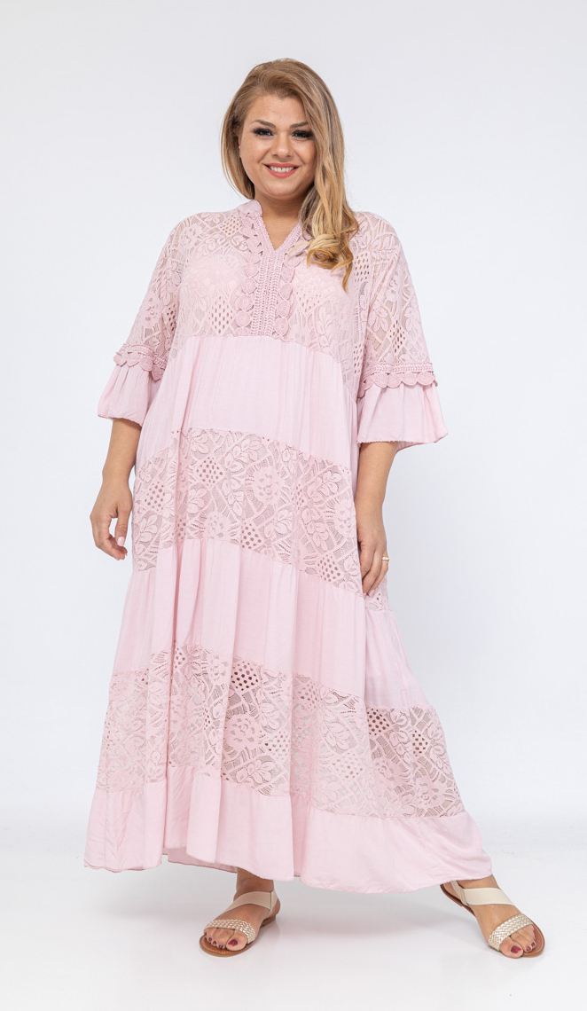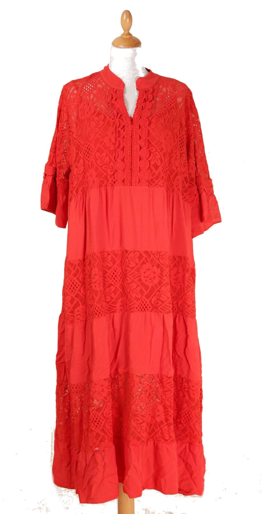 Punainen maksimekko pitsillä. A-linjainen malli. Alla joustava vuori, jonka pituus n 95 cm. Materiaalina kevyt ja miellyttävä 95 % puuvilla, 5% elastaani