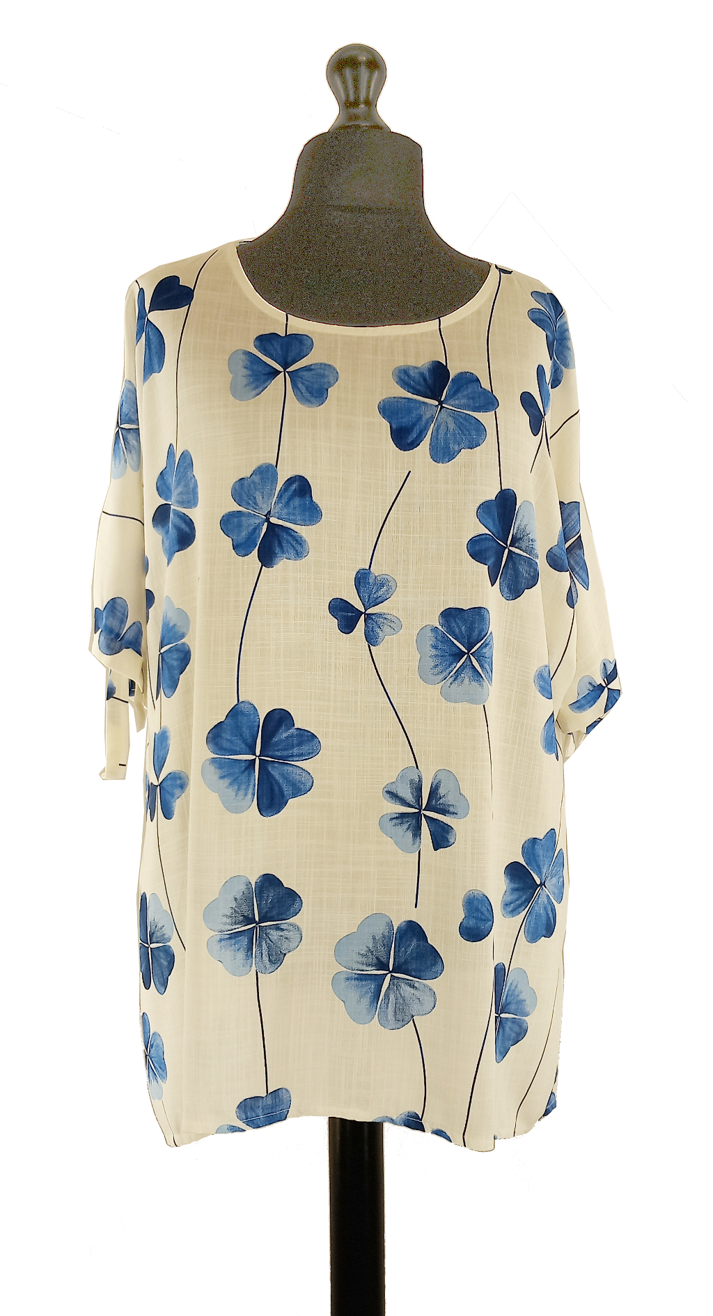 Valko-sininen lyhythihainen tunika apilakuviolla. A-linjaisen mallin hihansuissa solmittavat nyörit. Materiaalina kevyt ja miellyttävä 100% viskoosi ilman joustoa.