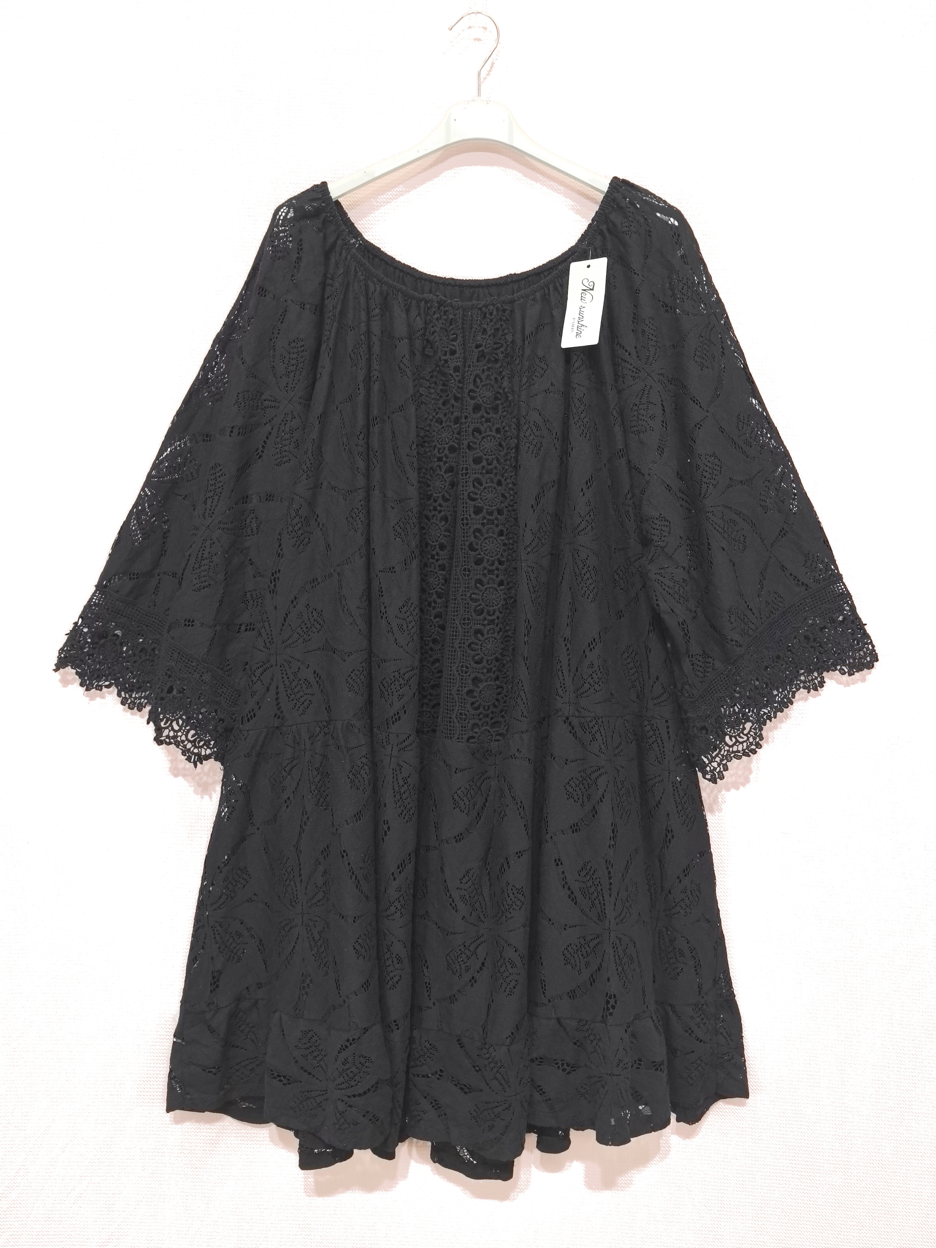 Svart vacker A-linjeformad spetsklänning/tunikaklänning i behagligt material. Materialet lätt och behagligt 30% polyester, 30% Viskos, 40% bomullTillverkad i Italien