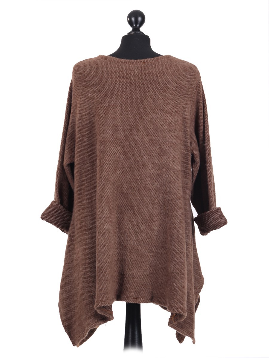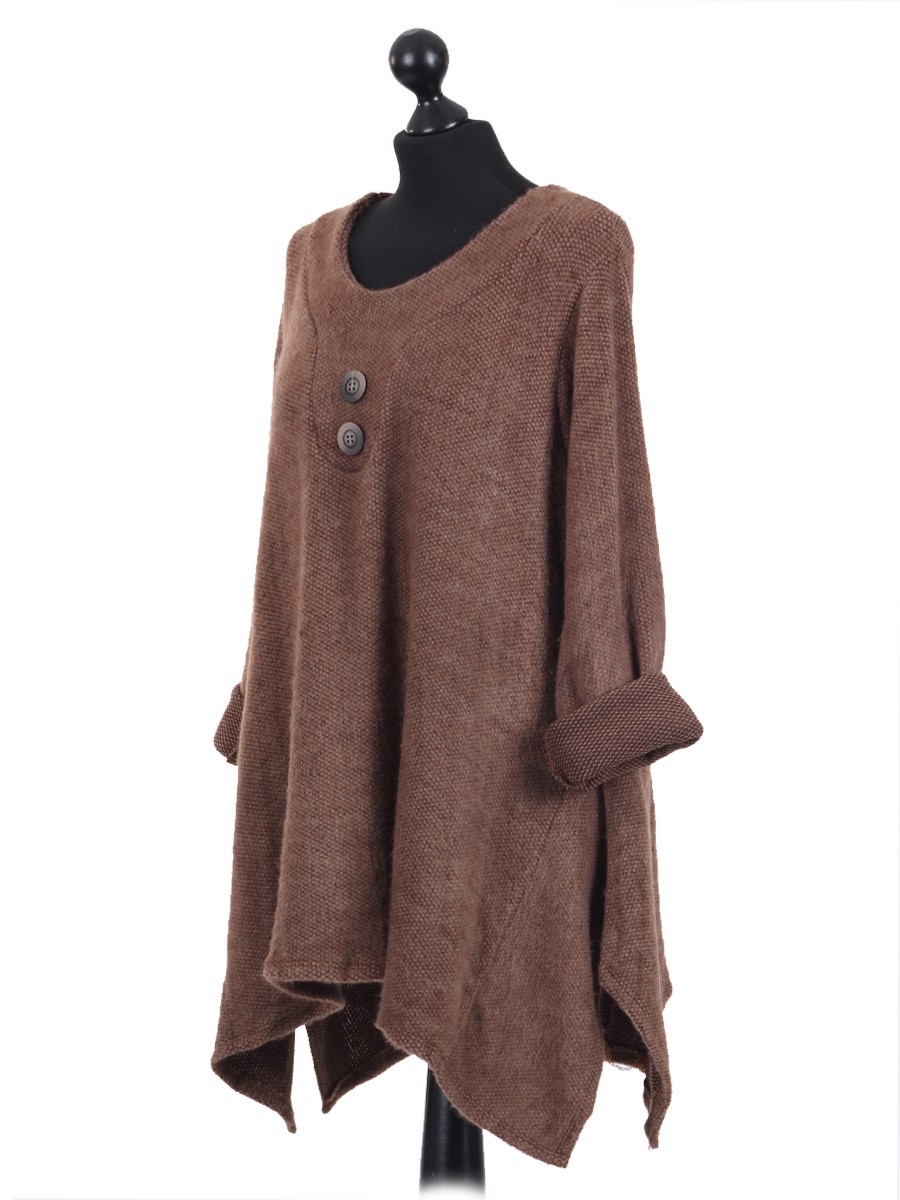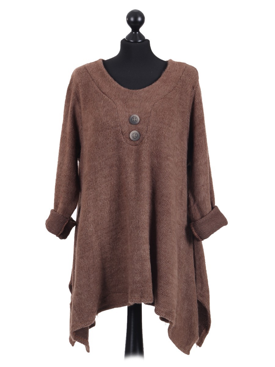 Brun (camel) tunika med asymmetrisk volang och två stora dekorknappar. A-linjad modell. Materialet mjukt, varmt och behagligt 65 % akryl, 30 % viskos, 5 % elastan